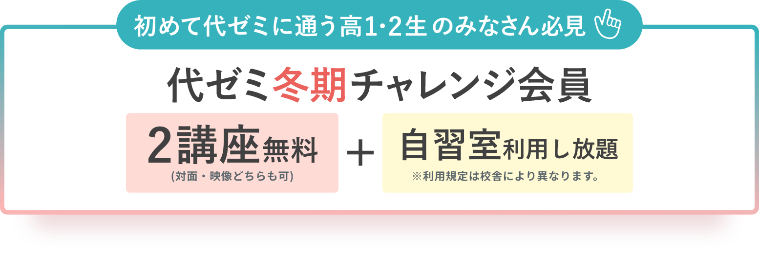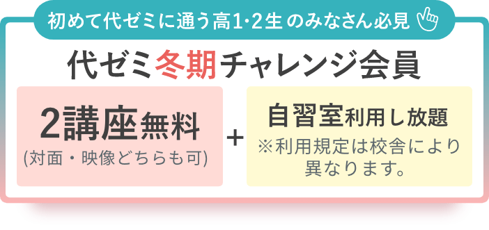 この冬から本格的に受験勉強を始めたいけれども、予備校選びに迷っている...そんな方は代ゼミのチャレンジ会員がおすすめです!2講座無料で受講可能なのでこの機会に苦手科目を受講して、受験への不安を取り除きましょう!