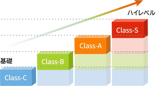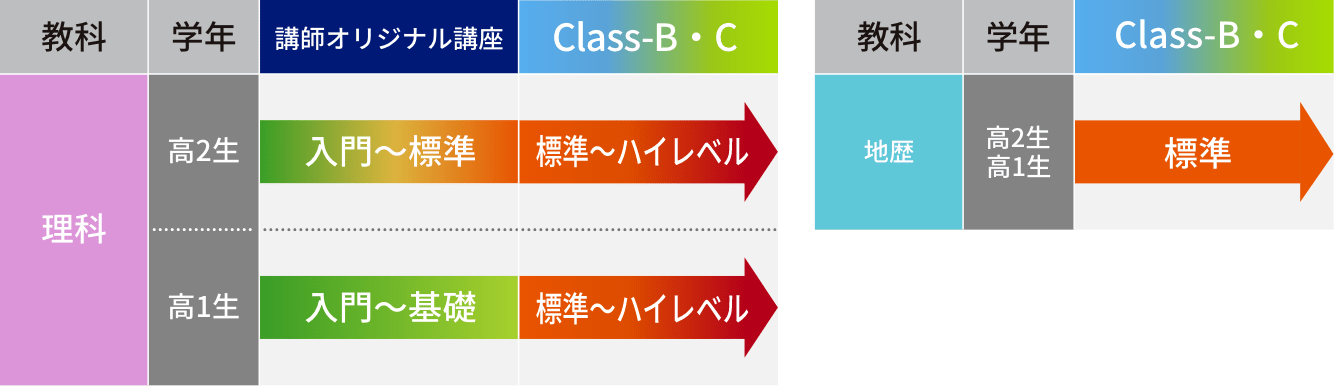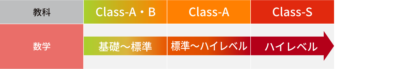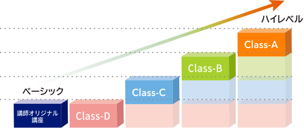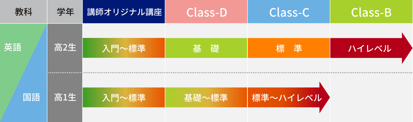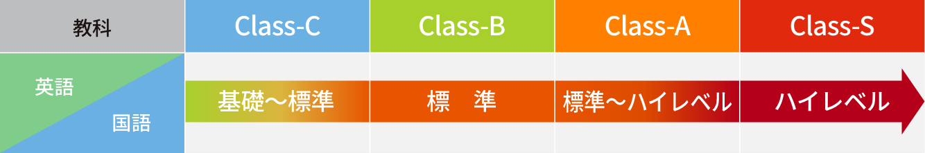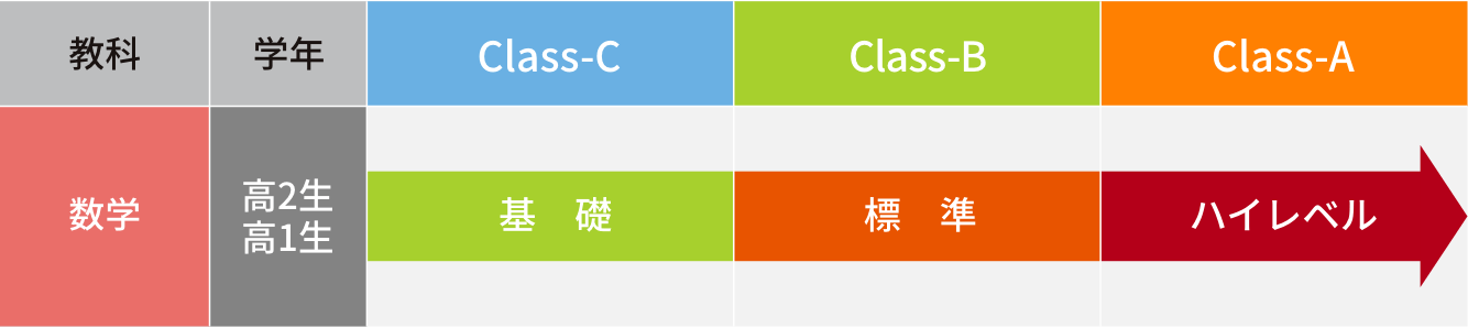 レベル別対策講座は、学年に関わらず、現在の学力や高校の授業進度に合ったClassからスタートすることができます。
