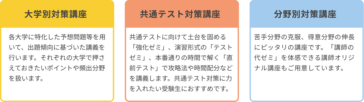 その他、定期テスト対策や、小論文講座、情報Ⅰ講座など目的別の講座をたくさんご用意しております!