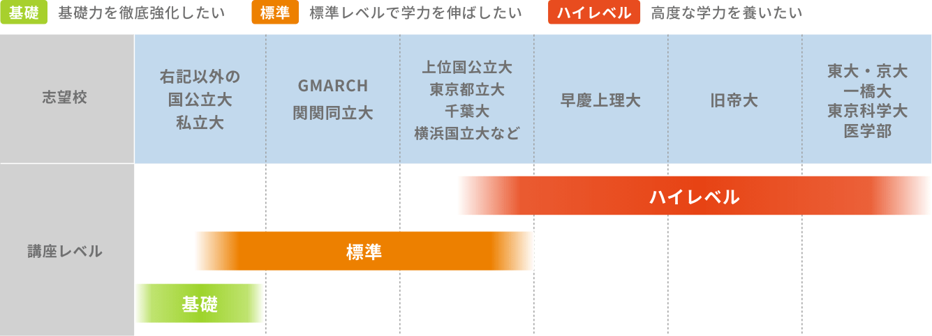 高校での基礎学力を養う講座から、受験を意識した演習中心の講座まで幅広いレベルをご用意しています。