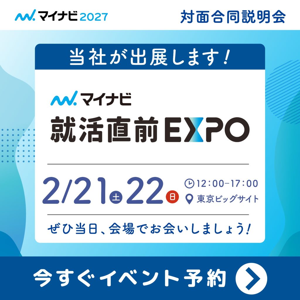 この度、2/22(日)に【東京】で開催される「マイナビ就活直前EXPO」に出展します!■日程:2月22日(日) 12時00分~17時00分 ■会場:東京ビッグサイト 西展示棟(〒135-0063 東京都江東区有明3-11-1) りんかい線「国際展示場」駅下車 徒歩7分 ゆりかもめ「東京ビッグサイト」駅下車 徒歩3分