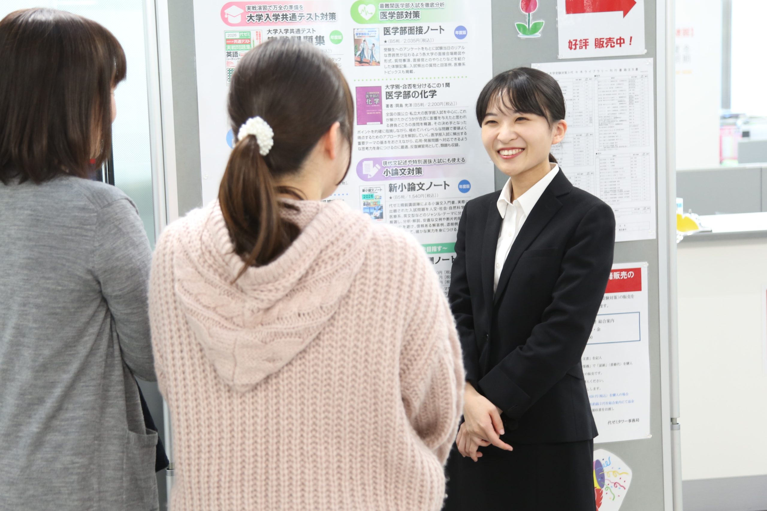 いつでも質問や相談を受けられる態勢でいることです。私の仕事では、職員や生徒、新規のお客様など、様々な方から情報や助言を求められます。それらに迅速に対応することが今の自分の大きな役割だと考えています。そのためには私があらゆる人にとって気軽に話せる存在でいることが不可欠なので、普段から人と接する際の態度や話を聴く姿勢には気をつけています。また、扱う情報を最新かつ整理した状態にしておくことも心がけています。代ゼミの情報から大学入試情報まで、当然全てを覚えることはできません。しかし最新情報をアップデートし、目当ての情報を素早く引き出せるよう、どこに何が書いてあるかは整理して把握するよう努めています。